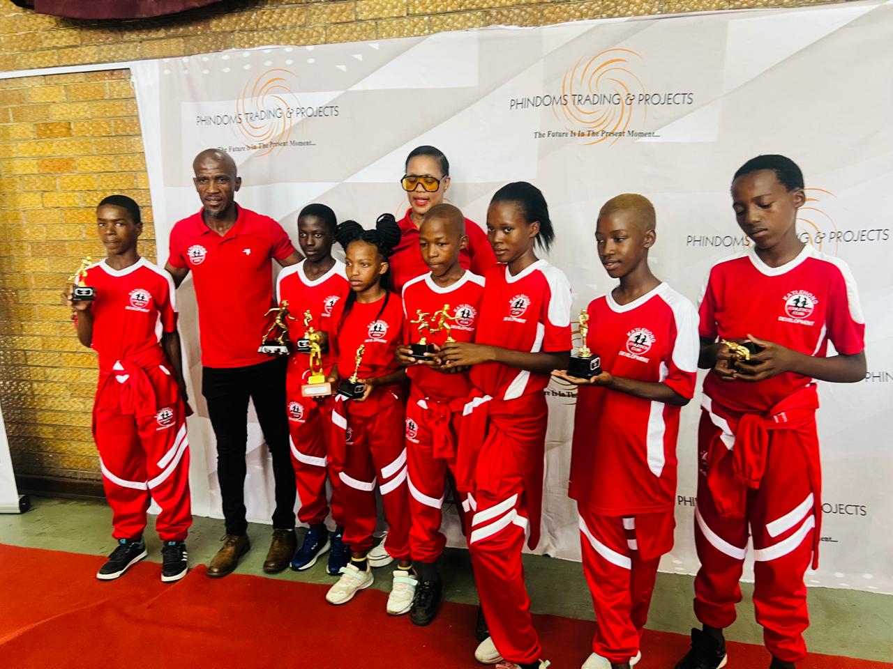 Mbhele and Phindile Ngcanca (Founder of Phindoms Trading and Projects) pose with the young athletes that were honoured with awards on the day. Photo Credit: Supplied.